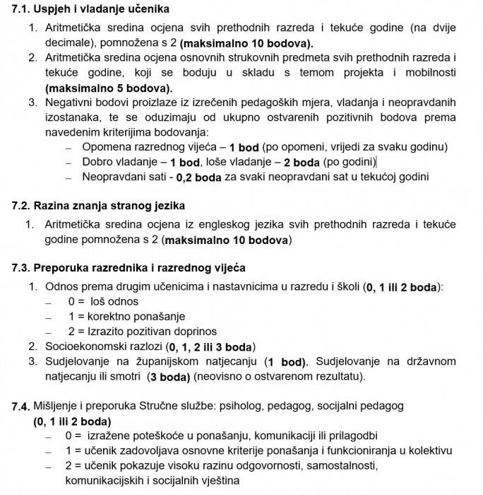 – Pri odabiru učenika bodovat će se uspjeh prethodnih godina i uspjeh tekuće godine zaključno s datumom 22.travnja 2026 godine. Ocjenjivanje kriterija odvijat će se po sljedećoj skali bodova: